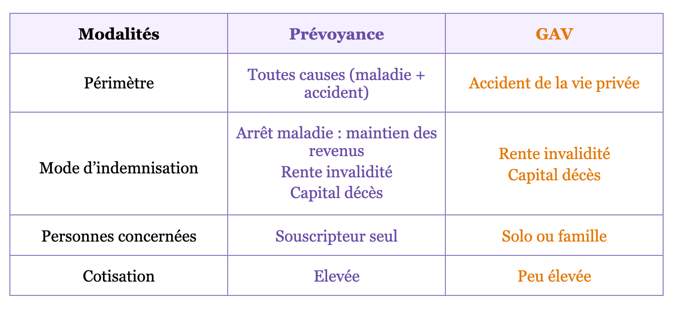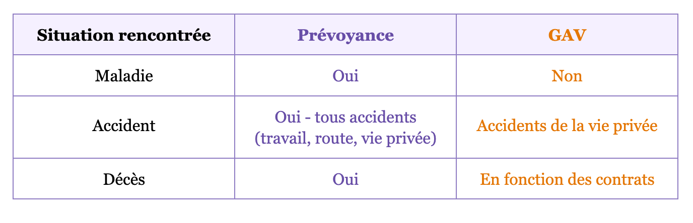 - Lorsqu’elle intervient, la GAV pourra avoir des garanties plus larges et/ou complémentaires à la prévoyance (par exemple : des garanties d’assistance).