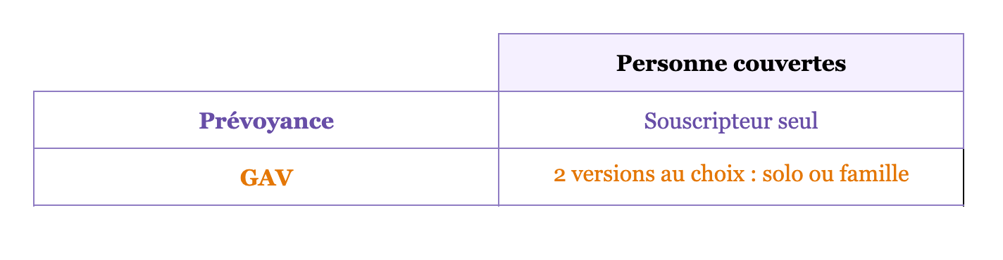 En effet, le contrat GAV va venir indemniser l’invalidité des enfants à condition que vous ayez souscrit la formule Famille, ce qui ne sera pas prévu dans votre contrat de prévoyance.